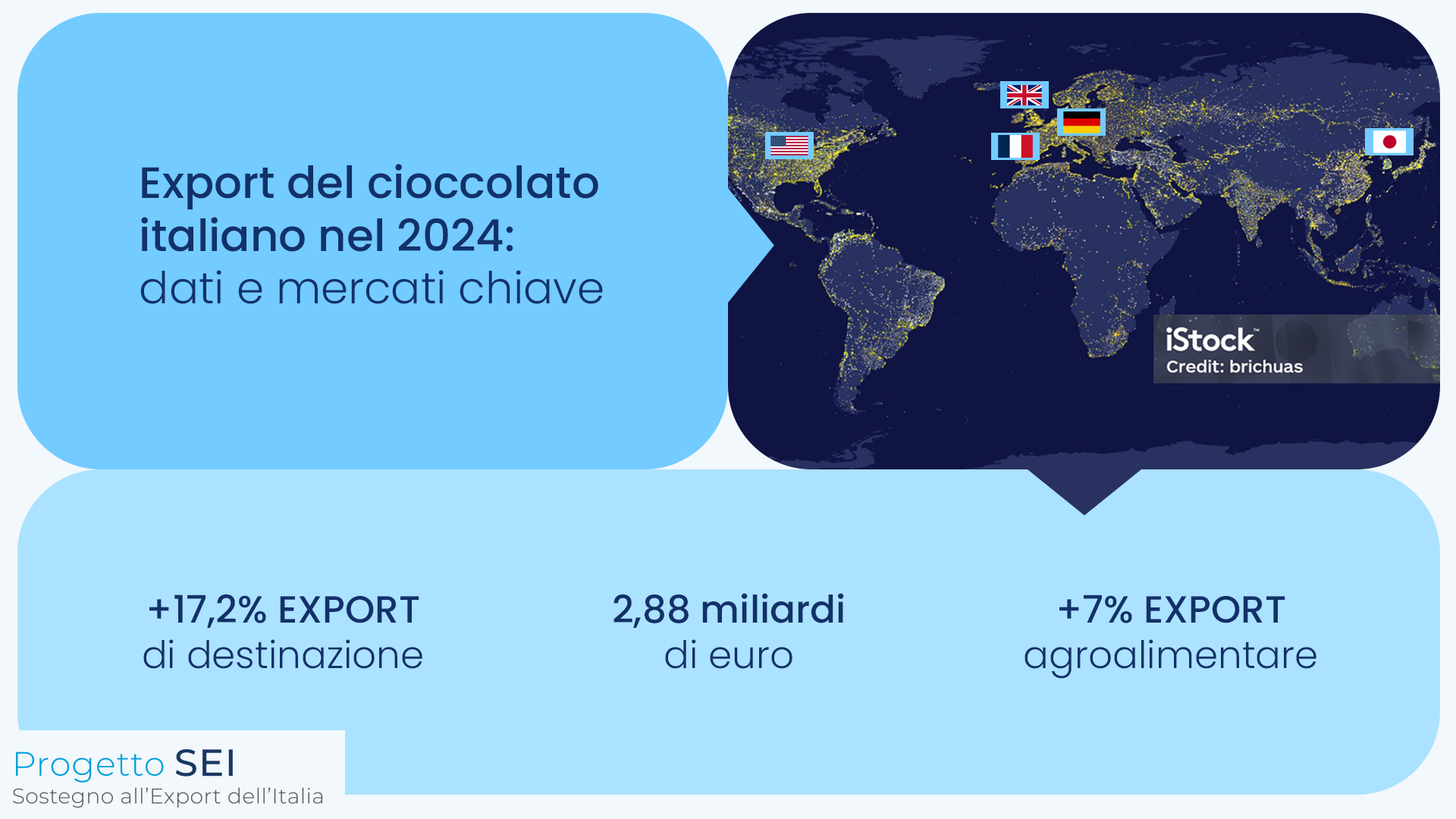 Secondo Eurostat, nel 2023 lʼItalia ha esportato 92.000 tonnellate di cioccolato verso paesi extra-UE, pari allʼ11% del totale UE. Il Regno Unito, gli Stati Uniti e il Canada si confermano tra le principali destinazioni del cioccolato Made in Italy fuori dallʼUnione Europea.