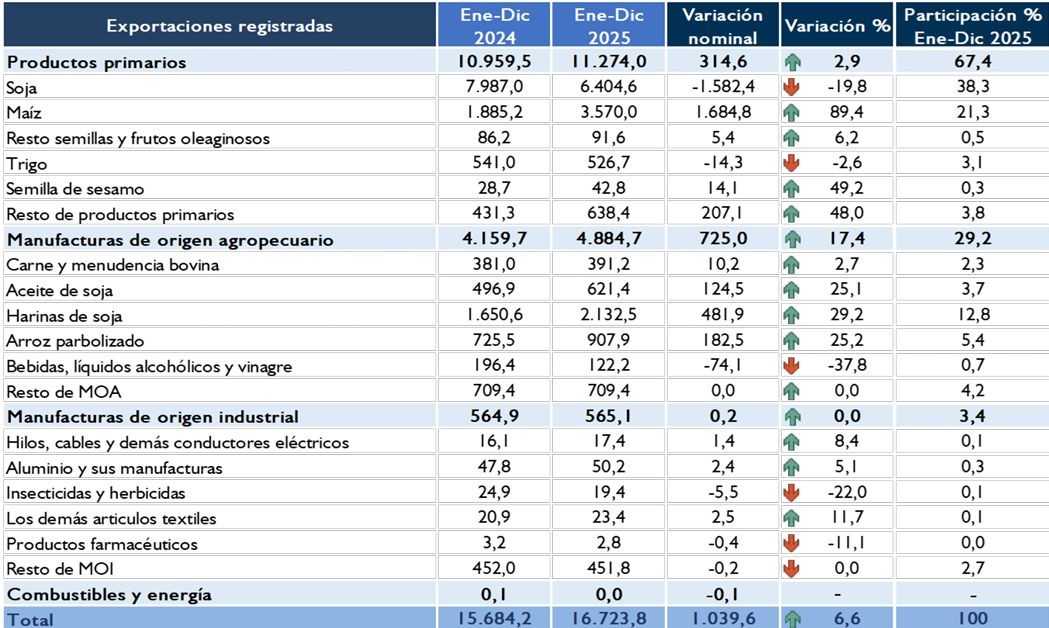 L'Argentina è al secondo posto, con una quota del 29,6% delle esportazioni registrate a dicembre 2025, per un valore di 3.282,2 milioni di dollari USA. I principali prodotti esportati in Argentina includevano soia, elettricità e componenti per auto.