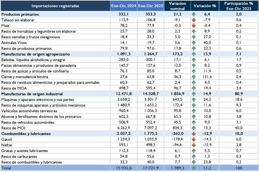 Le importazioni di beni manifatturieri di origine industriale (MOI) hanno raggiunto un valore di 14.328,7 milioni di dollari USA, con un incremento del 14,9% rispetto ai livelli registrati nel dicembre 2024. Tale incremento è dovuto principalmente ai maggiori acquisti di macchinari e apparecchiature elettriche e relative parti.