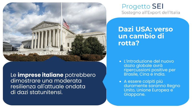 Donald Trump risponde rapidamente allo stop della Corte alzando i dazi globali con effetto immediato al 10% per un periodo di 150 giorni (appellandosi alla sezione 212 del Trade Act del 1974 che consente l'introduzione di dazi globali fino al 15%, per un periodo di 150 giorni).