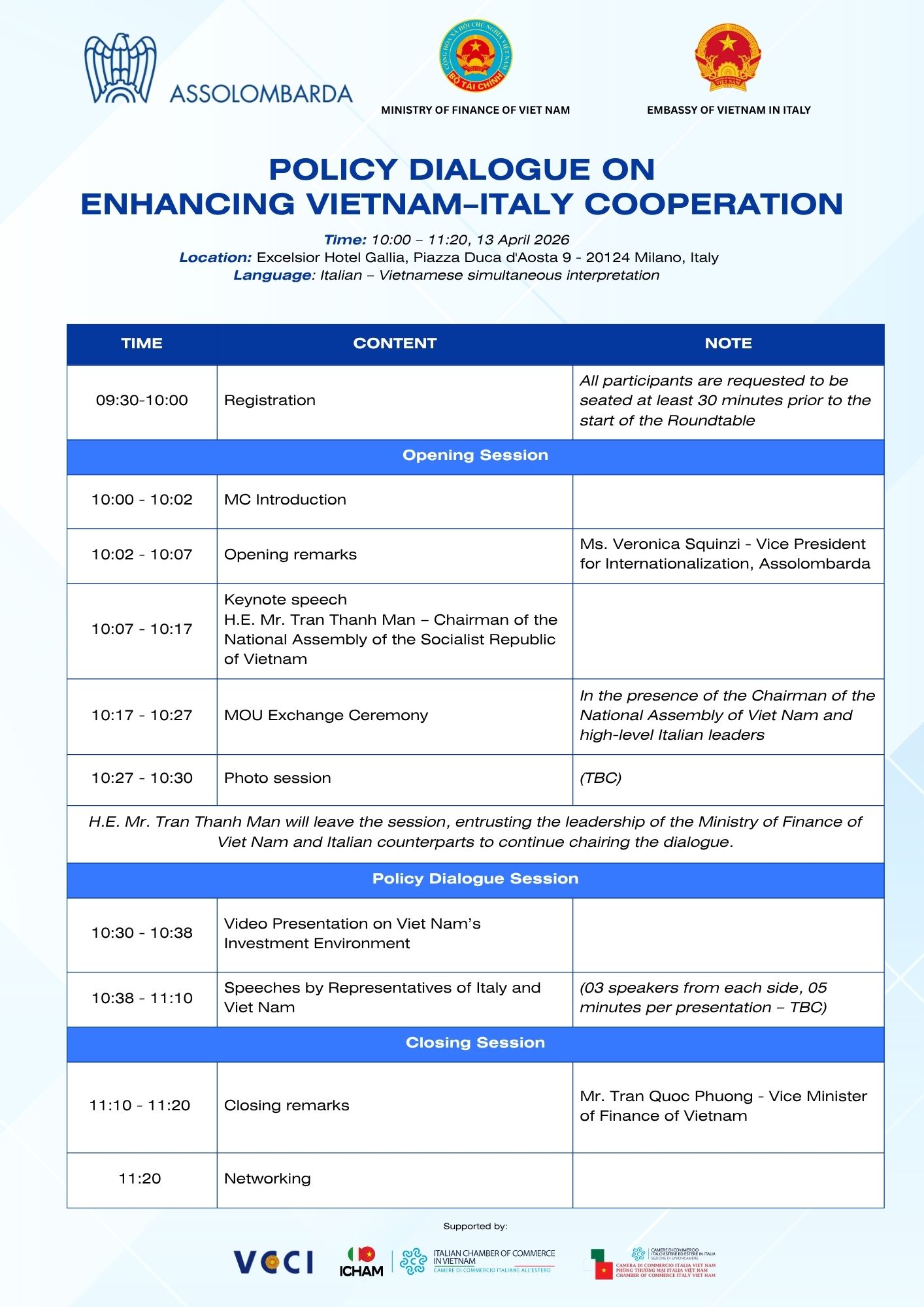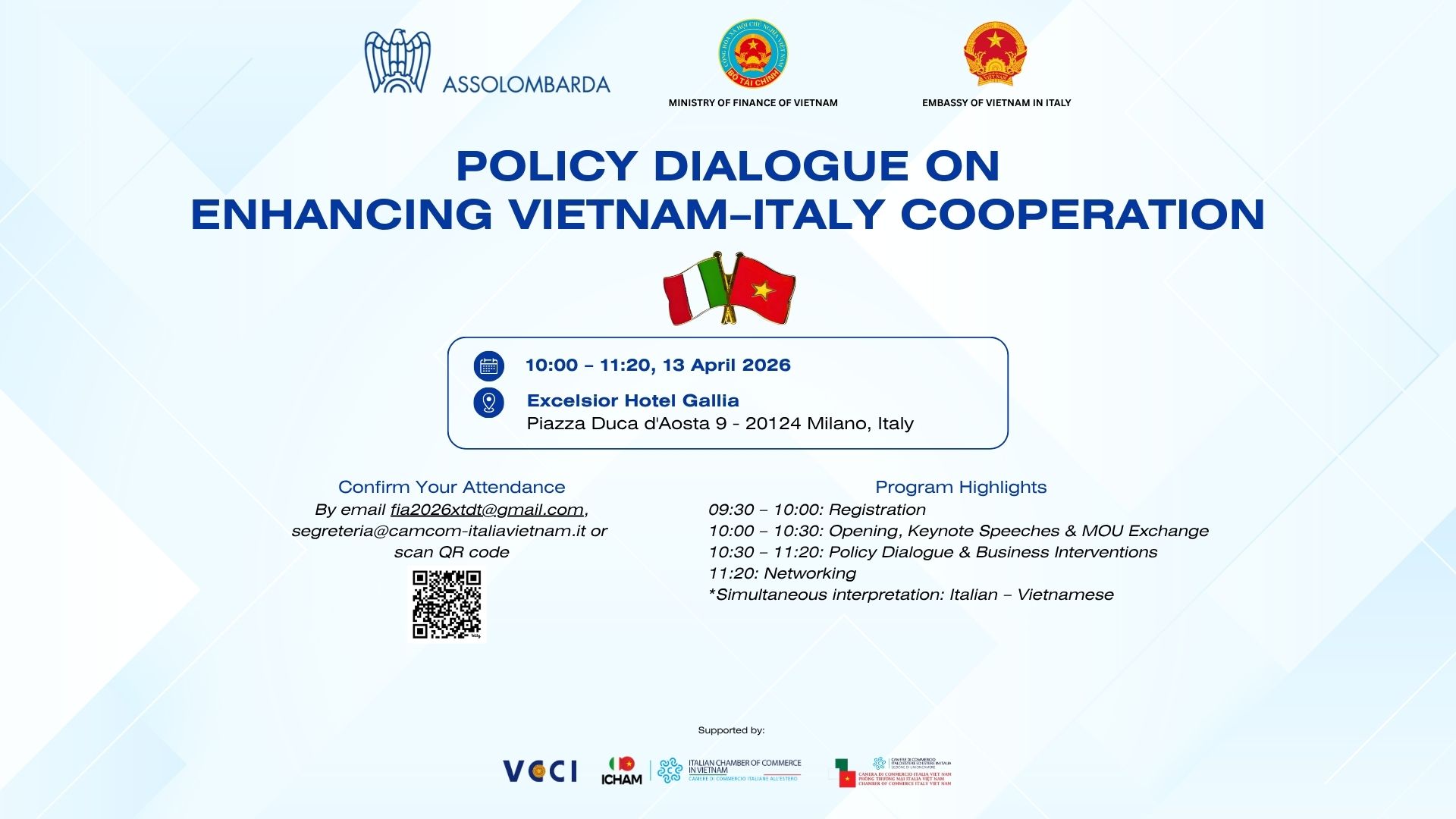 L’iniziativa, organizzata dal Ministero delle Finanze del Vietnam in coordinamento con l’Ambasciata del Vietnam in Italia e Assolombarda in collaborazione con la Camera di Commercio Italiana in Vietnam (ICHAM) e la Camera di Commercio Italia Vietnam si svolgerà lunedì 13 aprile 2026, dalle ore 10:00 alle 11:20, presso l’Excelsior Hotel Gallia (Piazza Duca d’Aosta 9, 20124 Milano).